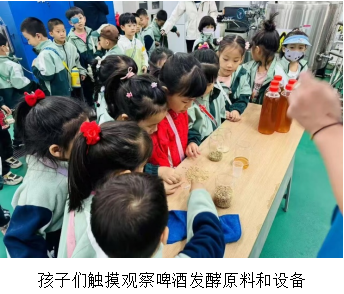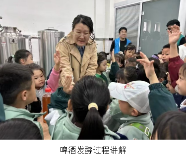 在工程训练中心A219啤酒实验室,孩子们瞬间化身充满好奇心的“小小科学家”。王蕾老师和卢庆华老师化身科学魔法师,用生动有趣的语言,向孩子们揭开啤酒酿造的神秘面纱。麦芽、水和酵母,这些看似普通的原料,在老师们的讲解下,仿佛拥有了神奇的魔力,在发酵过程中“变身”为香醇的啤酒。小朋友们不仅认真聆听讲解,还纷纷伸出小手,触摸大麦种子,近距离观察发酵原料和设备,感受着科学如何融入日常生活,现场不时响起惊叹声与欢笑声。