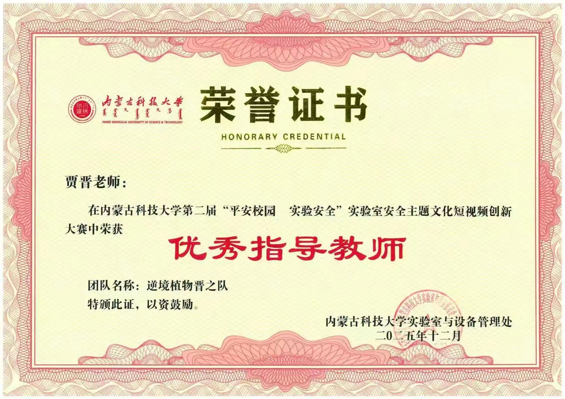 在77779193永利第二届"平安校园 实验安全"实验室安全主题文化短视频创新大赛中,由贾晋、乌日根老师指导的"逆境植物晋之队"(员工成员:王虹媛、张韵晗、王思璎、李紫艳、梅丽、王智莹、王凤硕)再创佳绩,凭借创意新颖、内容充实的作品荣获一等奖,同时两位指导教师荣获"优秀指导教师"称号。